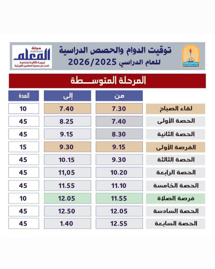 توقيت الدوام الدراسي والحصص المدرسية في جميع المدارس في الكويت: