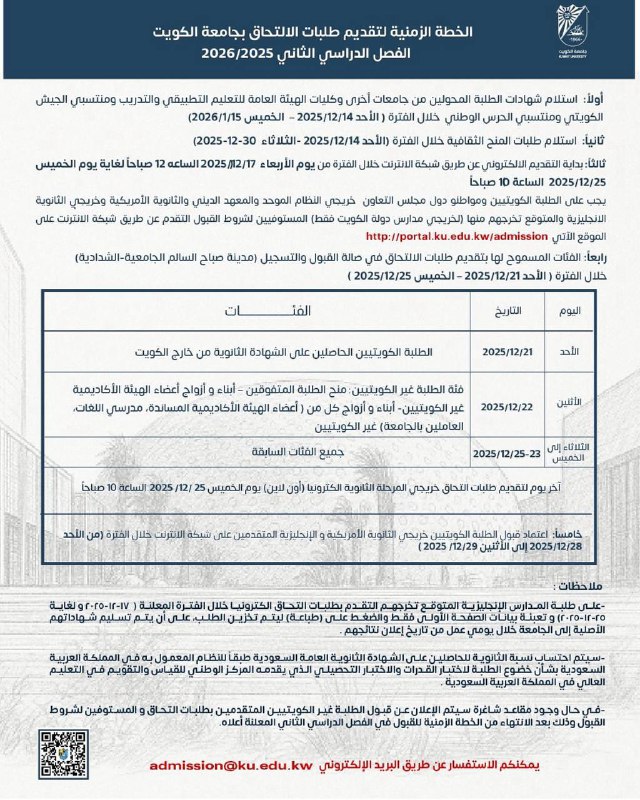 الخطة الزمنية لتقديم طلبات الالتحاق بجامعة الكويت الفصل الدراسي الأول 2026/2025:
