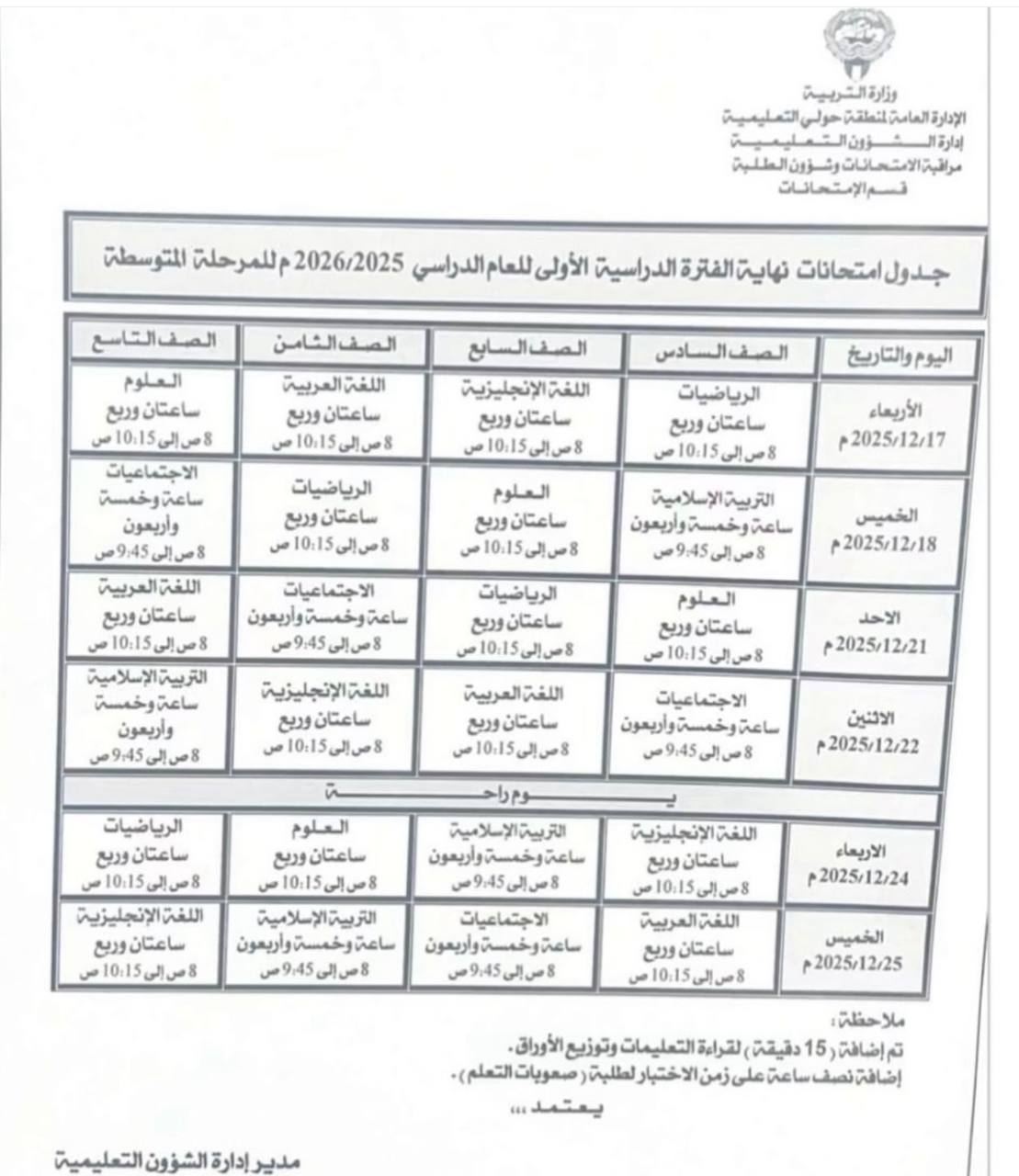 طلابنا الأعزاء نضع بين أيديكم جدول اختبارات منطقة حولي، فيما يخص منهج الفصل الدراسي الأول للمرحلة المتوسطة، وفقاً لما أقرته وزارة التربية في دولة الكويت.