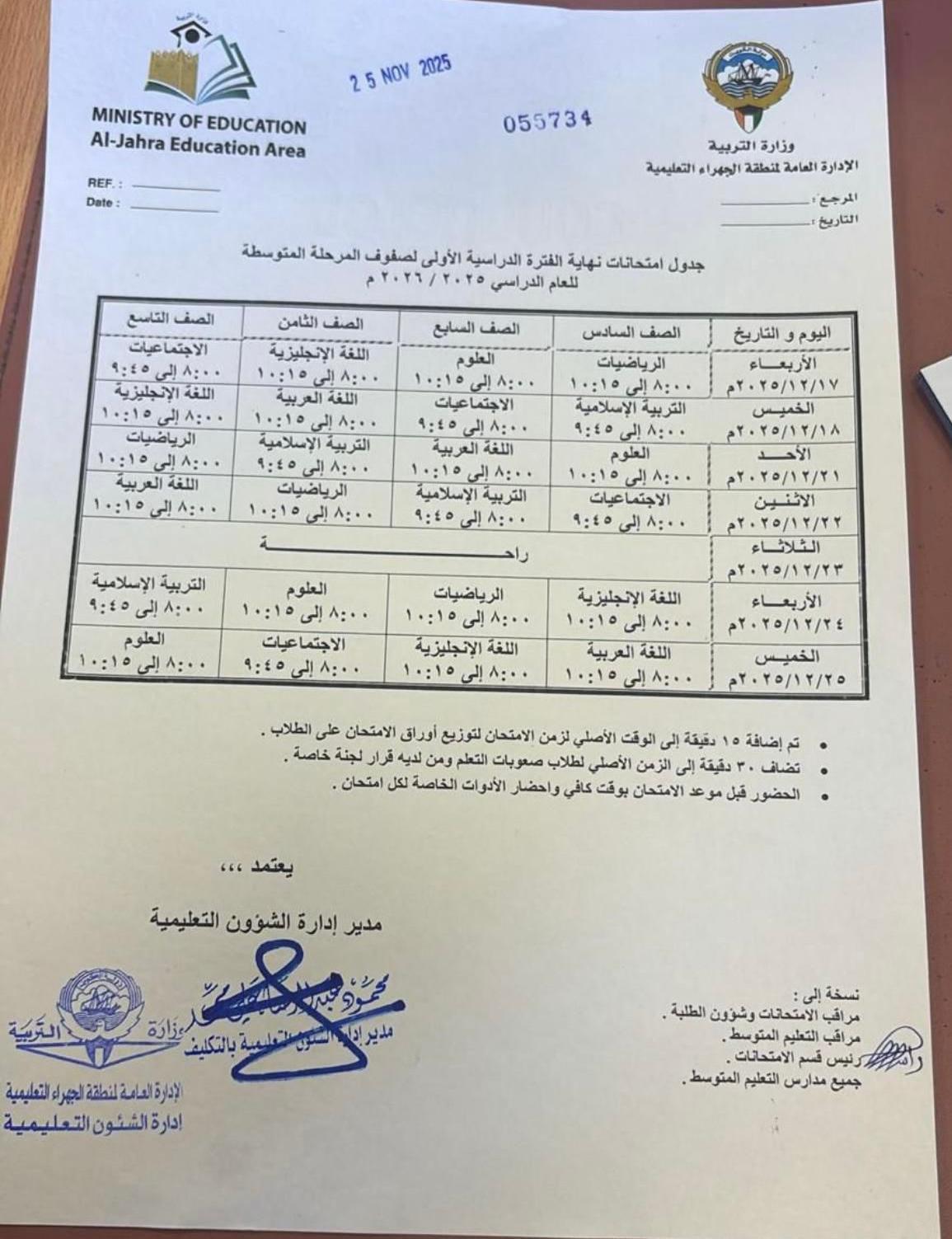 طلابنا الأعزاء نضع بين أيديكم جدول اختبارات منطقة الجهراء، فيما يخص منهج الفصل الدراسي الأول للمرحلة المتوسطة، وفقاً لما أقرته وزارة التربية في دولة الكويت.