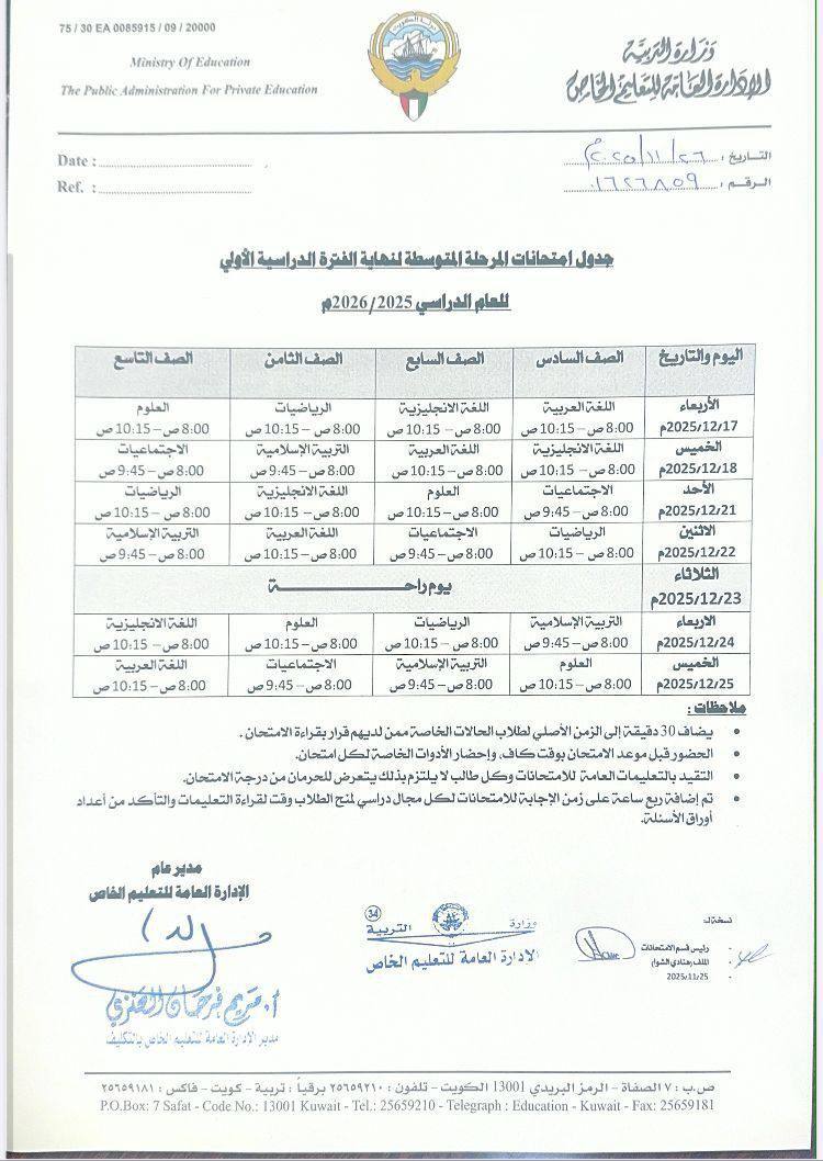 جدول اختبارات التعليم الخاص للمرحلة المتوسطة في الفصل الأول المنهج الكويتي: